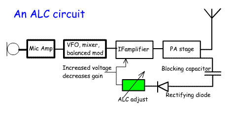 function and use of a manual RF power control. Most transceivers use an automatic level control (ALC) to control the output from the final amplifier stage..This is achieved by sensing the power via a capacitor, converting it to a DC voltage using a diode or a diode ring and feeding it back to an earlier IF stage which reduces the gain when the ALC exceeds it upper limit which is set by a variable resistor. External linear amplifiers often have their own built in ALCs to reduce the power to a predetermined level. Most transceivers also have a manual gain control. This can be used to set the power level between about 5 Watts and 100 Watts. This is used for example: