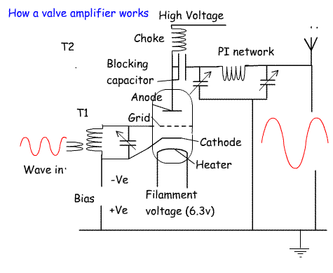 4g.3 Recall the operation of a valve in a power amplifier. Recall the function for the heater, cathode, control grid and anode. Recall the advantages and disadvantages of valve PA circuits. Although valves have almost disappeared from amateur equipment, they are still used extensively in high power linear amplifiers. How a triode valve amplifier works The filament heats up the cathode when the 6.3v is applied. As the cathode surface is warmed up by the heater the cathode surface produces a cloud of electrons. These are attracted to the positive anode. An impedance step up transformer (T1) which matches the 50 ohm input from the driver stage to the high impedance at the grid. The input wave is applied between the cathode and the grid. When the wave is going positive, some of the electrons are attracted to the grid and the anode current falls. When the wave is going negative, electrons will be repelled from the grid and more electrons will flow towards the anode. This variation in electron /current flow will follow the input wave and will cause an alternating voltage on the output side of the blocking capacitor. The Pi network acts as a low pass filter to reduce harmonics above the operating frequency. It also matches the high impedance output from the anode to the 50 ohms of the antenna. The two variable capacitors of the Pi network are labelled LOAD and TUNE on a valve linear amplifier. The coil of the Pi network is often switched to enable it to cover all the HF amateur bands. Often labelled BANDS. By adjusting the negative bias on the control grid different classes of amplifier can be implemented. For linear amplification (SSB and AM) the bias is set up for class A amplification. It is about 30% efficient. For class B the bias is set to only amplify part of the wave. These are about 50% efficient, but not as linear For class C amplification FM and CW the bias is set so that even less of the wave is amplified. These are about 75% efficient. Advantages and disadvantages of valve PAs Advantages * Very linear. Low distortion with no feedback required. * Have a high input impedance * Valves are high voltage devices and therefore can handle the high voltages in a linear amplifier. Transistors are low voltage devices and easily damaged by high voltages. * Very resistant to overloads * They plug into a base and can easily be replaced. * A single valve provides more gain than a single transistor and so fewer stages of amplification are required. If the antenna is resonant they are faster to start up than a valve amplifier. Disadvantages * Not as cost effective as transistors. Cost more to buy and replace * Need replacing more often * Need a separate heater supply that doesn't contribute power to the RF output. Take longer to set up requiring the adjustment of the BAND switch, LOAD and TUNE capacitors. * They create more heat that can affect the stability of nearby VFOs * Need to warm up before they will operate. This is overcome by leaving the heater permanently on (Standby). Transistors can be used immediately. * Need forced air cooling to keep them at a reasonable temperature * Higher voltages make circuits more dangerous to humans. * Valves all have the same polarity unlike transistors that have PNP and NPN configurations which make possible more circuit configurations. |