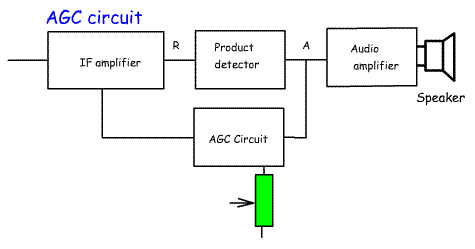 4p.1 Understand the derivation and use of an AGC voltage. As the signal increases in strength, the AGC reduces the level of amplification so that the audio stays at a fairly constant level and so that the IF amplifier is not overdriven causing distortion. The first step is to sample the signal, This can be done at audio frequencies before the audio amplifier (point A) or at RF frequencies after the final IF stage (point R). The signal is rectified to produce a DC voltage which is used to control the IF gain of the receiver. There are chips specially designed to carry out all the functions of the AGC system. Some IF amplifiers require an increasing negative voltage to reduce their gain. In this case the positive voltage would have to be inverted to form a negative voltage. The AGC circuit may have switched capacitors to alter the delay time of the AGC and a variable resistor to adjust the threshold where the AGC starts to operate. |