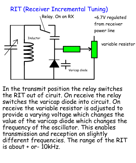 Recall the function and use of the RIT control. The RIT control stands for receiver incremental tune. This could be a varicap diode across the VFO. If a received station is not quite on your frequency, switch on the RIT and adjust the VFO frequency to him them in. On transmit, the RIT is switched off so as not to alter the transmit frequency. |