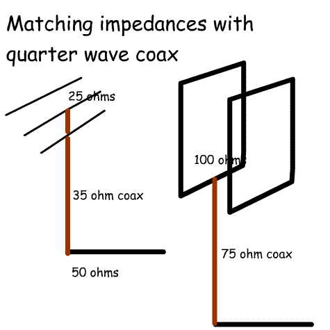 5a.2 Understand that a quarter-wave length of feeder can be used as an impedance transformer. Apply simple examples of the formula Z02=Zin×Zout. A quarter wave length of coax can be used to match two different impedances. For example a 3 element beam may have an impedance at the feed point of 25 ohms. If we want to match this to 50 ohm coax this could be achieved by connecting a quarter wave of 35 ohm coax between the antenna feed point and the 50 ohm coax. A 2 element quad having a feed point of 100 ohms could be matched to 50 ohm coax using a quarter wave of 75 ohm coax. The general formula is Where: Z02 = impedance of coaxial cable Zin = input impedance of antenna Zout = output impedance of rig (usually 50 ohm) |