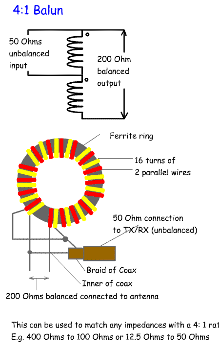 Baluns consist of 2 or more wires wound round a ferrite ring or rod. A 4:1 balun has a about 17 turns consisting of two parallel wires wound round the ferrite. A 1:1 balun has about 17 turns consisting of three parallel wires wound round the ferrite. The drawings show how baluns are connected up. There are other ways of constructing baluns: A choke balun consists of a coil of coax either with or without a ferrite ring. These are often used just below an antenna to stop RF current flowing down the braid of coax. Choke balun ![]() A sleeve balun consists of a length of coax with ferrite rings threaded on the outside. ![]() |