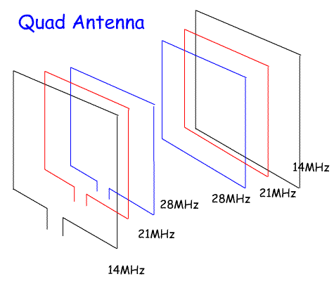 Quad antennas These consist of several full size loops mounted on a set of light weight supports. There is a separate driven element loop for each band and a separate director or reflector loop for each band. The quad antenna has a high gain and wider bandwidth than a 3 element Yagi beam. Single band quad antennas are used on 2m and 70cm where they give good gain and take up less room than a conventional Yagi. You will also need to remind yourself of the antennas mentioned in the Foundation and Intermediate syllabus. At Foundation level you had to identify the half-wave dipole, λ/4 ground plane, Yagi, end-fed wire and 5/8λ antennas. At Intermediate level recall the structure of a three-element Yagi |
