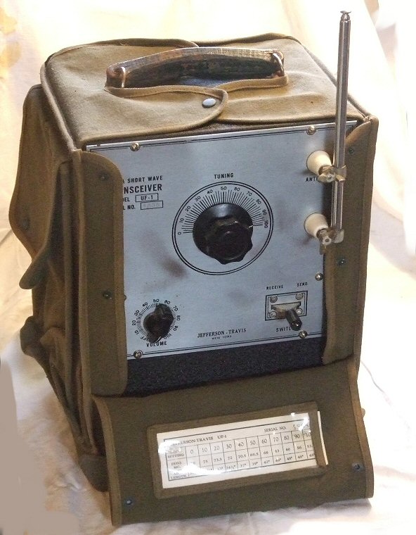UF-1 Ultra-High Shortwave Transceiver, three valve transceiver built 1942 by Jefferson-Travis of the USA. The radio could be operated with three batteries carried internally or with a vibrator power supply, fitted in place of the batteries and powered from an external 12v supply.The tuning range is 53.5 to 76 MHz. 3 valves: 1 x 3Q5-GT and 2 x 1G6-GT/G. Battery operated the set uses 4 batteries: 2 x 45v, 1.5V and 6V. Operating off the vibrator pack the set uses: 108 - 120V; 1.5V; 6 V. The heaters Voltage/current per valve is 1.4V at 0.1A each while the power consumption is quoted as 300mA for heaters and 40mA HT current on receive rising to 65mA on transmit. When operating off the 12v vibrator pack, Power Supply Number 2009A, the set consumes around 1.2A on receive and 1.6A on transmit.