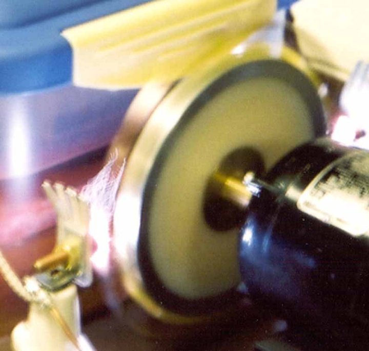 Protection against high voltage spikes (in excess of 18kV) is provided by the safety gap. The rotary gap consists of 16 rotating electrodes against 2 stationary electrodes. The spark gap acts as a voltage controlled switch: open when not firing, and short (~2 ohms) when firing. The power transformer is a Neon Sign transformer rated at 12kV 60mA. The coefficient of coupling is approximate 0.95. Thus, when the secondary winding is short circuited by the rotary spark gap, the maximum currwnt is limited to 60mA.