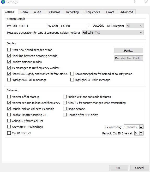 for WSJT-X v2.1.2 by K1JT My Call: Your Call Sign My Grid Your Locator Display: Tick boxes 2/3/4/5 Behaviour Tick boxes 2/3 Tx Watchdog 3 minutes |
