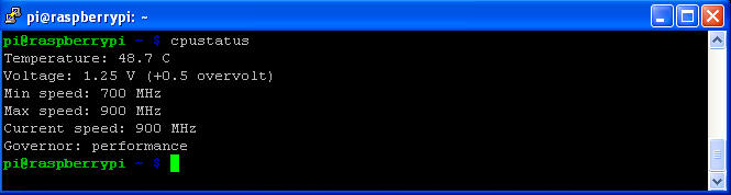 This script is useful to monitor current the status of the Rpi's CPU – clock rate, voltage, temperature, see example of its usage below: