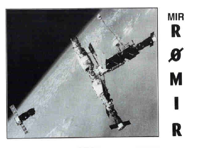 FRENTE DE LA TARJETA QSL, QUE CERTIFICA LOS CONTACTOS, DONDE SE APRECIA LA ESTACION MIR, JUNTO A UN MODULO SOYUZ.