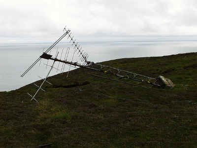 This photo below of the damaged GB3LER beacon antennas was taken by Tony Erwood G7AFE in August 2000. The 2m and 70cm antennas have suffered from water ingress, and cannot be repaired unfortunately, but the 6m dipole was OK and is now in use at the new GB3LER beacon site.