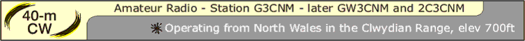 | More recently, with Frank 'well-retired', activity is mainly on 40-metres CW. The retirement QTH is a small bungalow which, at 700ft asl, overlooks Liverpool Bay, The Irish Sea and much of Lancashire. This provides an uninterupted view to the horizon at 34 miles from about 280 degs through north to 080 degs for the simple vertical antenna. The antenna sits atop a good-sized earth mat and has interchangeable top 'whips' for 40m and 80m. By far the most activity takes place on 40m cw. |