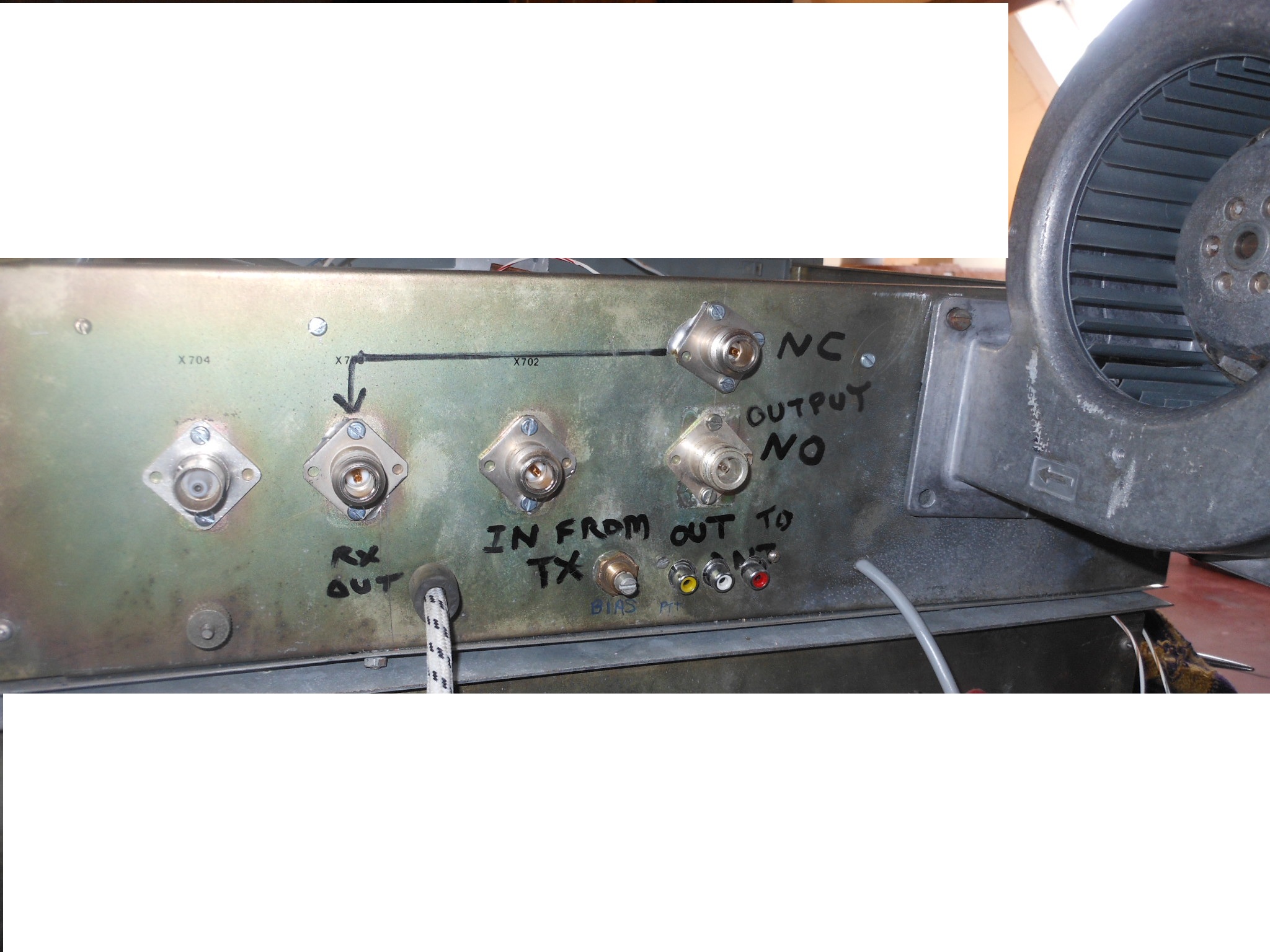 Rear panel is fitted with N types, spaced to fit a CX-520 relay, and more N types to feed drive in and Rx out. Phonos for PTT in, DC out to power the CX520 and one spare socket. HV goes in on C-type.