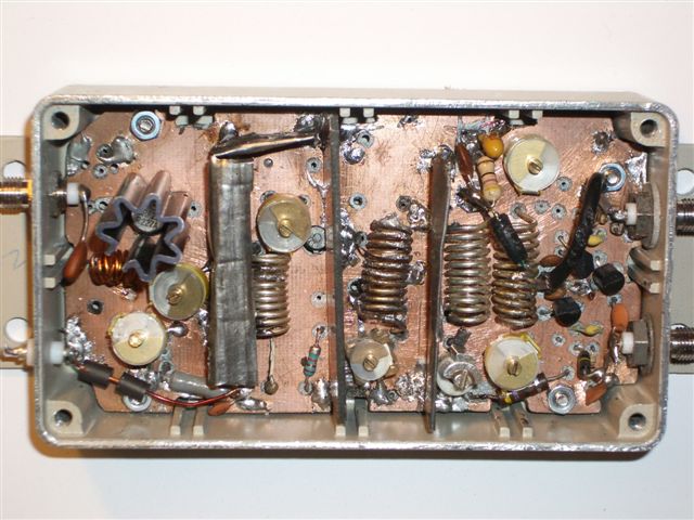 A variable resistor on the front panel controls the IF drive into the transverter. The mixer is a pair of BF256 in push-pull, then a two pole bandpass filter, followed by a BF961 driving a MRF237