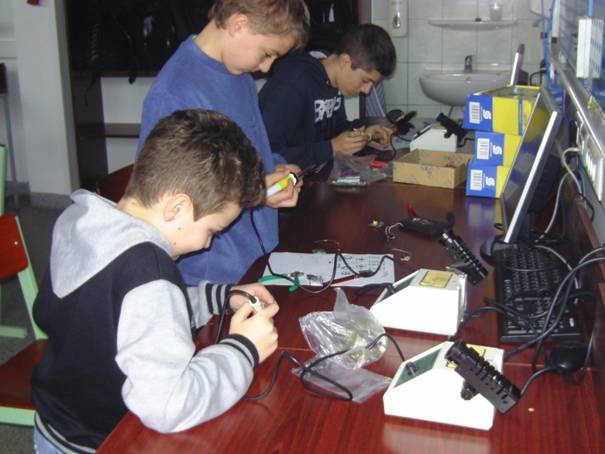 A képen a legfiatalabb szakköri tagjaink a morse gyakorló áramkört forrasztják