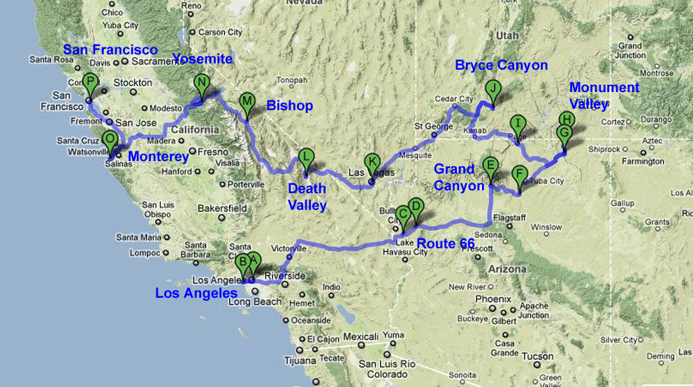 After a 3 days stay in L.A. start of a 2200 miles trip thru the National Parks Grand Canyon, Monument Valley, Death Valley and Yosemite.