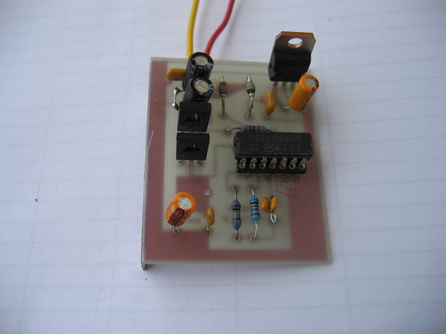 La costruzione di questo dispositivo può avvenire tramite filatura su una basetta mille fori o su circuito stampato. Il pcb misura 57x45 mm. La costruzione non presenta nessuna difficoltà. Per montare i componenti sulla basetta fare riferimento al disegno di montaggio. Il condensatore C3 sarebbe in realtà da 47 microF non polarizzato. E' difficile se non impossibile trovare tale valore. Al suo posto usiamo due condensatori da 100 microF in serie e con il polo positivo collegati assieme (come si vede anche dallo schema elettrico). I due diodi D1 e D2 sono diodi schottky da 2 o 3 Ampere. Il regolatore di tensione IC2 (7818) deve essere provvisto di aletta di raffreddamento (anche se sulle foto non è presente).