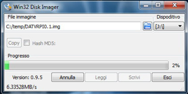Scaricare il programma http://sourceforge.net/projects/win32diskimager/ creare una cartella temp, scaricare tutto il programma e in winrar, nel vostro PC di Windows (per OS otre utilizzano la guida Descritto Scarica Decomprimere l'archivio (utilizzando winrar sotto le finestre, per esempio) Si dovrebbe avere una porta SD sul vostro Pc fisico, ho presente sul portatile, L' immagine sotto da l'esempio di come avviene la procedura, lancia il programma da una parte del Hdisk win32diskimage si vi chiede dove immagine DATVRPI0.1.img avete messo nella cartella TEMP.