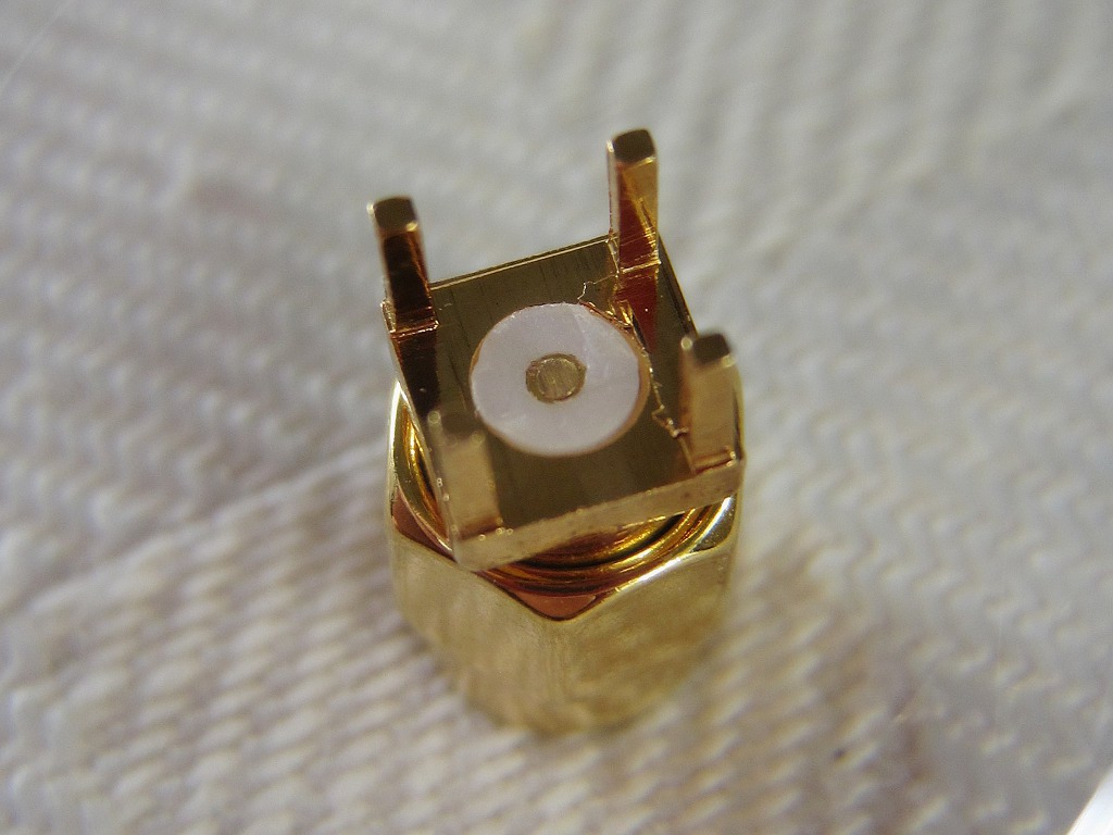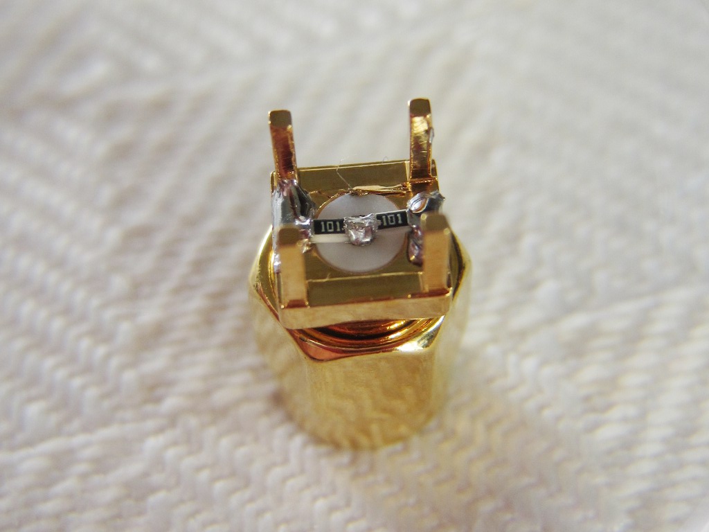 A connector shorted on the back with a small copper disk cut out from thin copper tape; the copper disk just filled the void between the center conductor and the surrounding ground and was then covered with tin-lead solder.