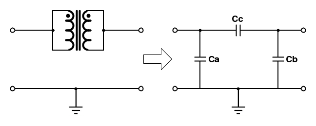 To measure the inter-winding capacitance, the transformer was connected as shown below, with the windings short-circuited. The measured two-port S-parameters were then used to extract the three parasitic capacitances, Ca, Cb and Cc.