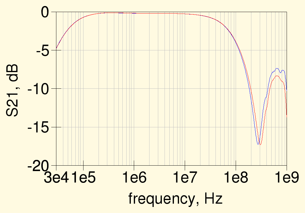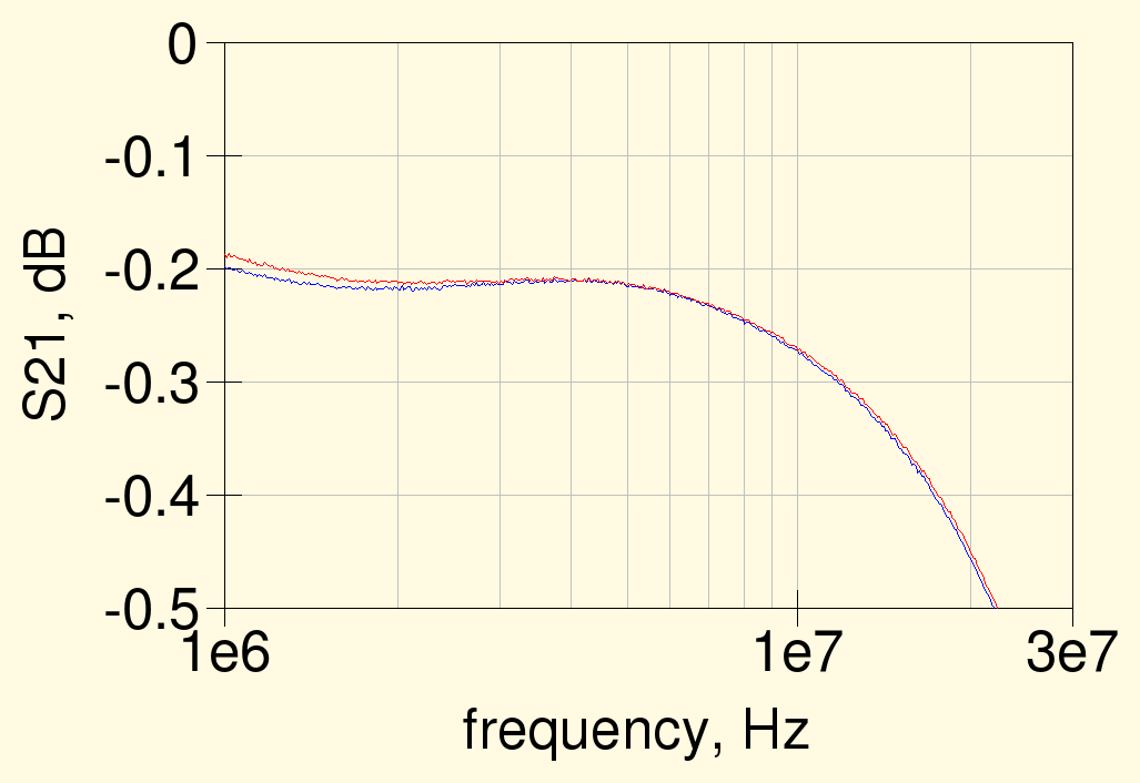 To simplify the construction I did not use the Teflon insulating tubes suggested in LBDX to keep the windings separate but used a wire with thick Teflon insulation. The measured frequency response for the two transformers is shown below: