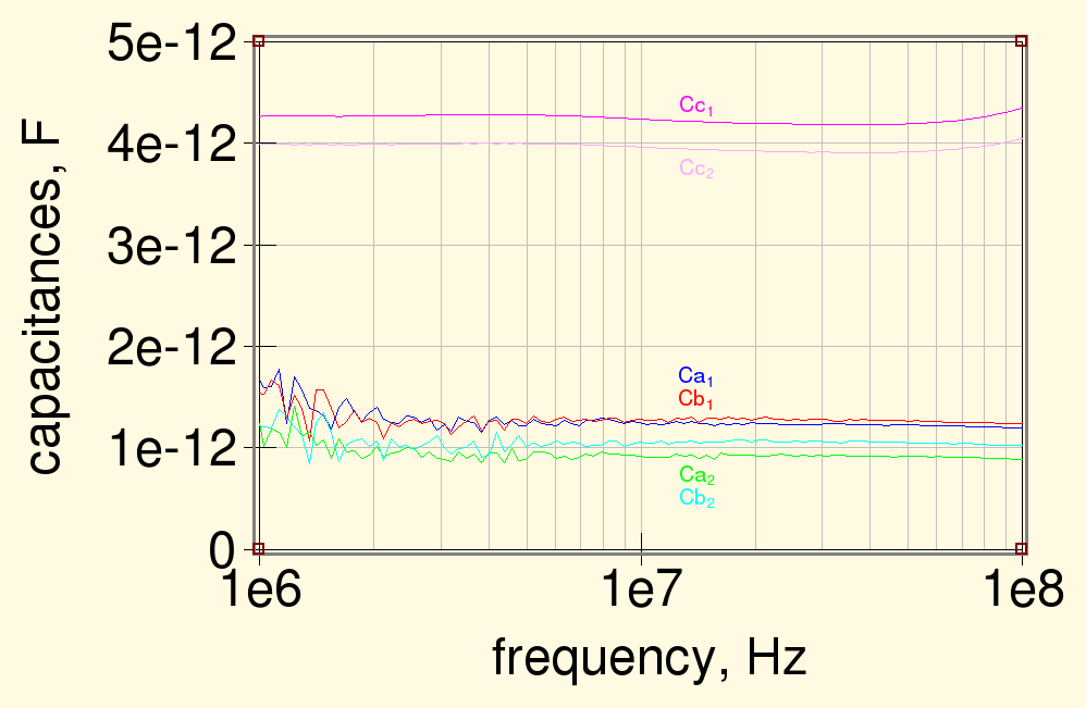 The resulting equivalent capacitances are shown in the next graph (both transformers shown above were measured, respective results are denoted by the suffixes 1 and 2 in the graph below); note that they are fairly constant between 1 and 100 MHz, which confirms that the short-circuited transformer is well approximated by this equivalent circuit in the frequency range of interest.