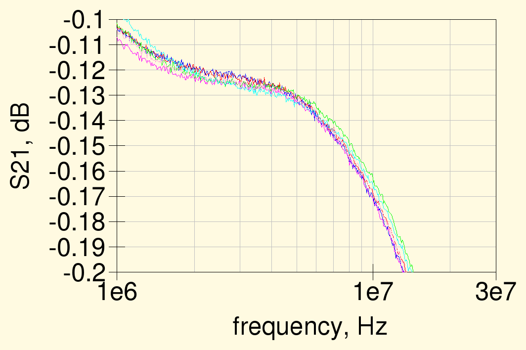 note that the response for all the 5 transformers tested is practically identical and the losses at 1.8 MHz are around 0.12 dB; this is somewhat higher than the "less than 0.1 dB" reported in Fig. 7-25 of LBDX, maybe because of the thin wire used.