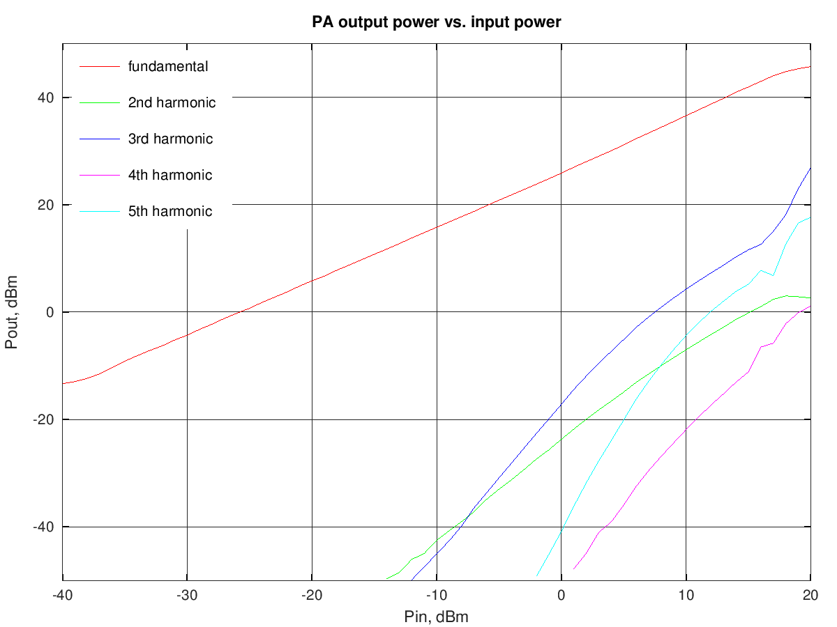 The data above are summarized in the following picture; all data were measured with -30 dBm at the PA input (i.e. approximately -4 dBm output):