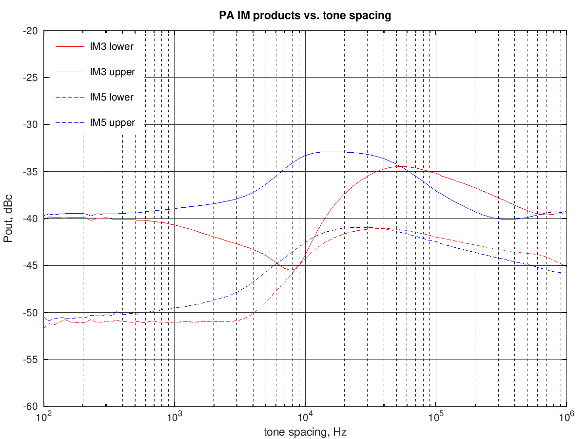 The graph below shows the relative amplitude of the IMD products (separately for upper and lower products) for a two-tone test with varying tone spacing at 7.1 W PEP output: