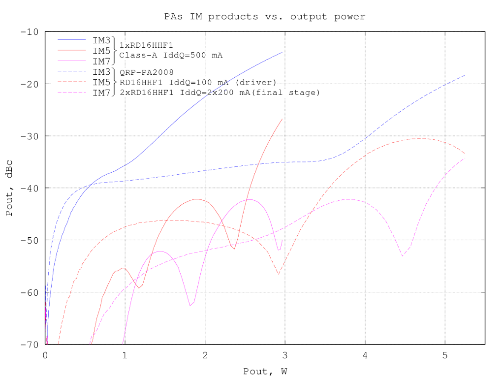 IMD vs. power output compared with the QRP-PA2008 with higher final stage bias for two tones around 10 MHz with 10 kHz spacing (output power is per-tone).