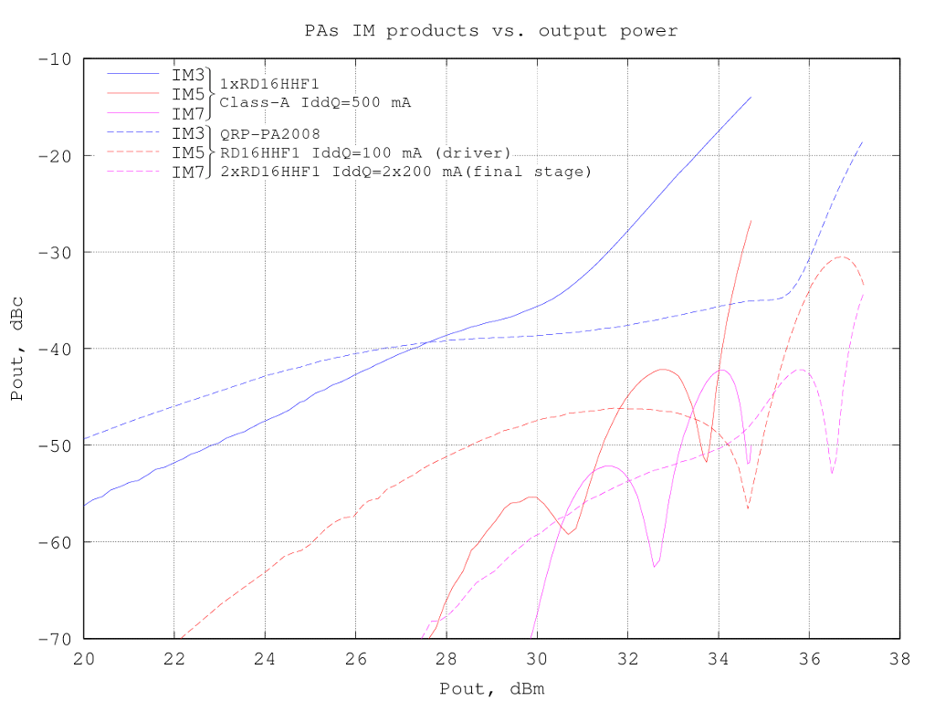 The third-order intermodulation products amplitude w.r.t the output power per-tone is shown in the graph below (to obtain the actual [average] output power multiply the value by two, to have the PEP, multiply by 4):