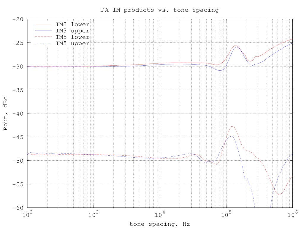 the IMD products are practically at the same level and without much dependency on the tone spacing up to about 100 kHz, where there is probably a resonance of the drain power supply network.