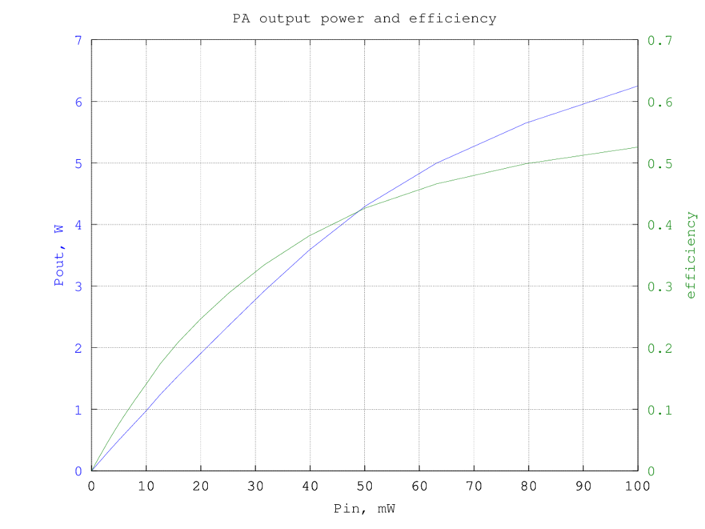 and the resulting efficiency is shown in the graphs below (data are the same for the two graphs, in the first the input and output power are in dBm and in the second they are in watt):
