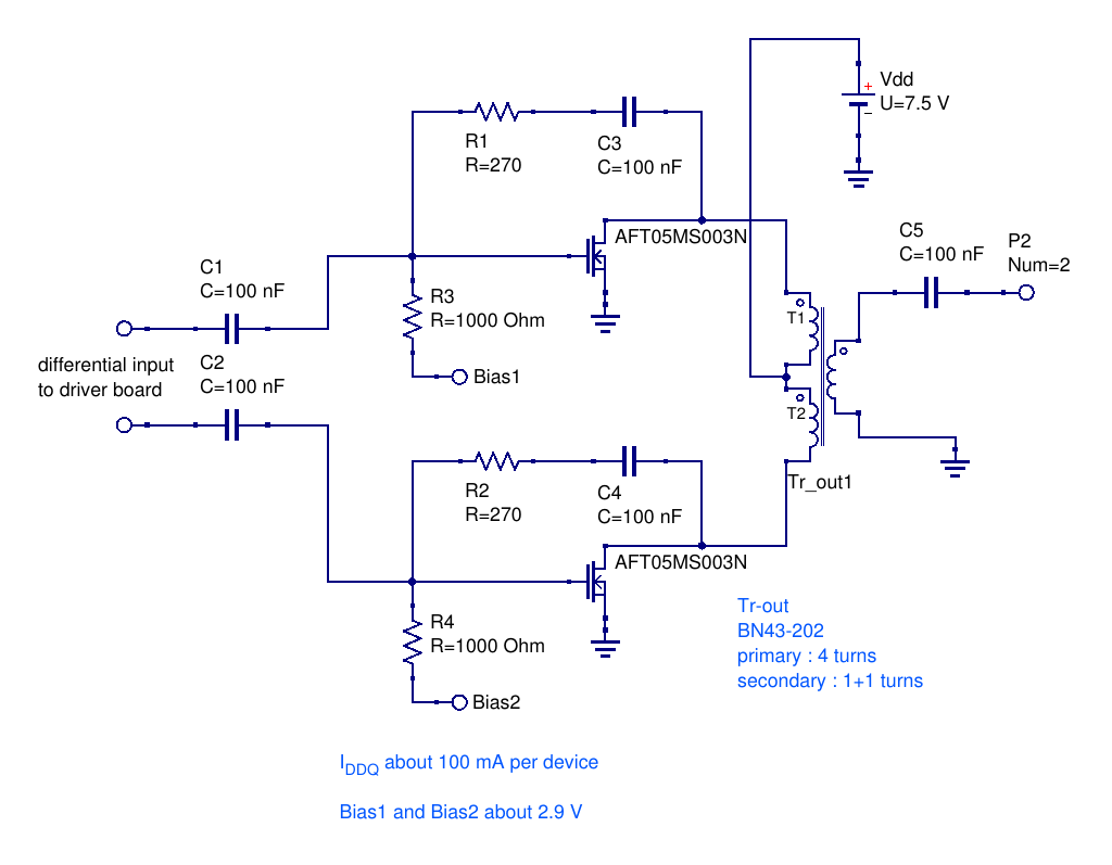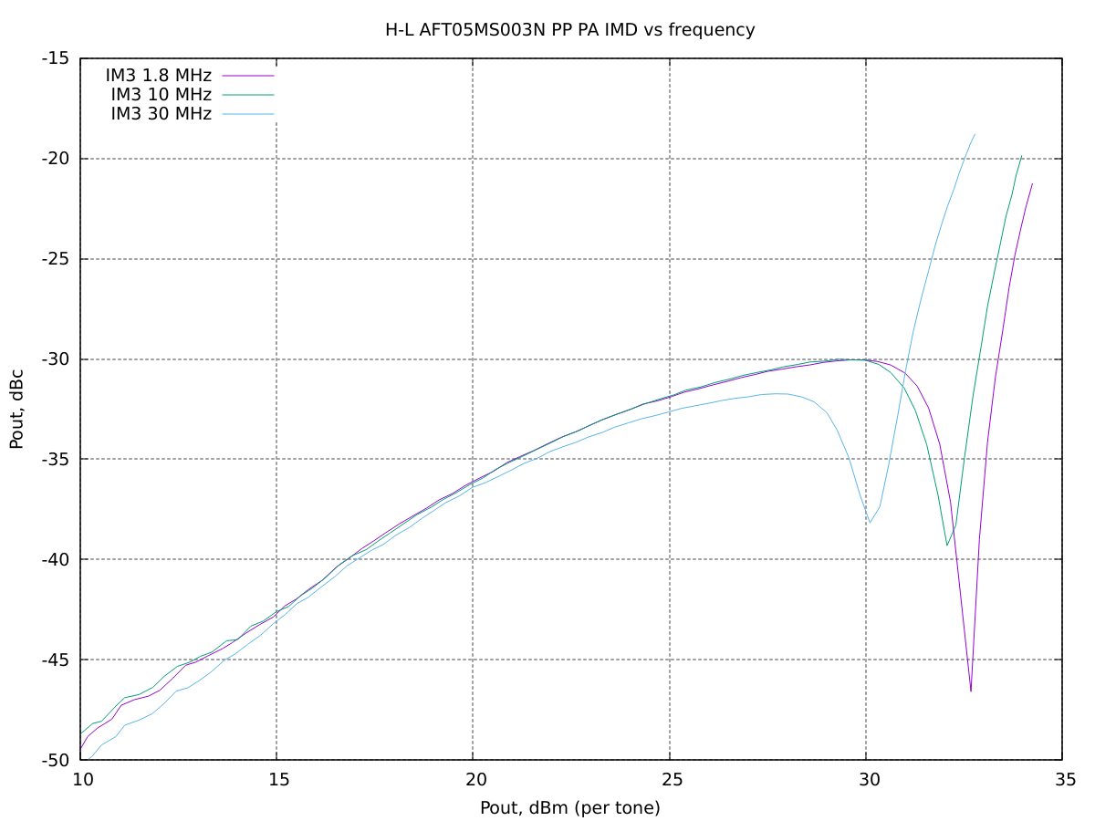 Measurements on a QRP power amplifier using a push-pull of AFT05MS003N.