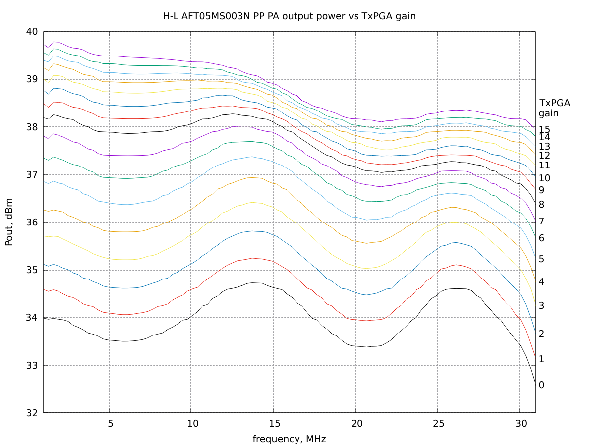 TX output harmonics, DAC spurs and images vs. frequency for a TxPGA gain setting of 6, which gives an output power around 37 dBm (5 W), see graph above.