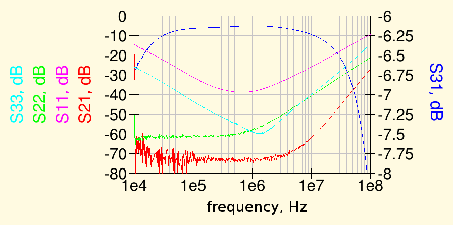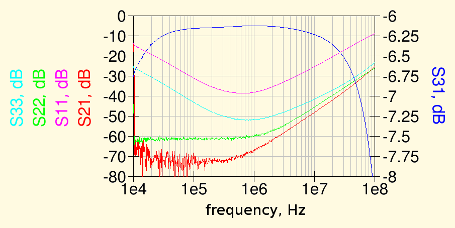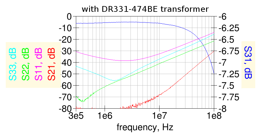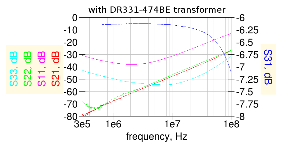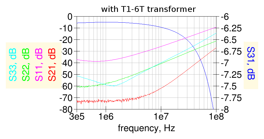 for comparison, here below are the original bridge (with the T1-6T transformer) S-parameters over the same frequency range