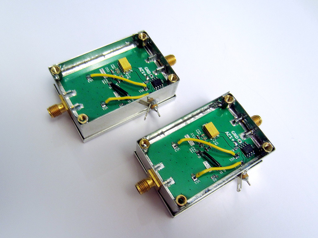 I was needing a couple of low-distortion medium-power amplifier for increasing the maximum power output of the generators I use for IMD testing, so I built a couple of the PD85004 push-pull amplifiers described here, and in particular the lowest-distortion variant with center-tapped input transformer and gate-drain feedback. In a two-tone test this particular configuration can put out up to 6 W PEP while maintaining an output IMD3 better than -40 dBc.