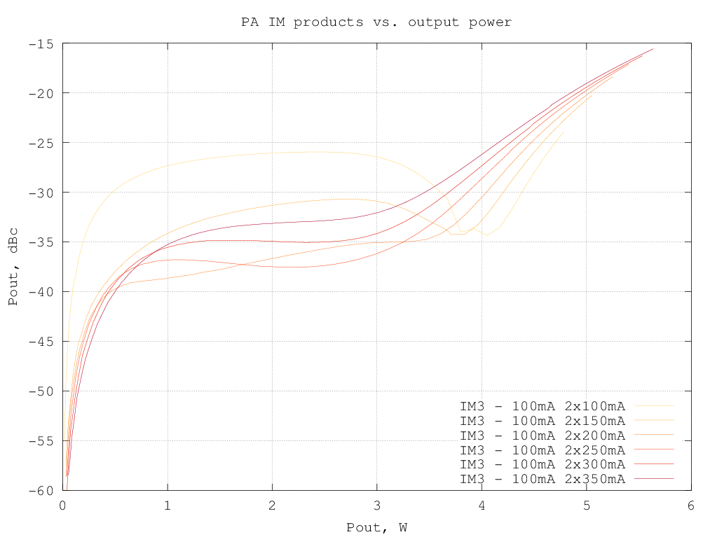 The third-order intermodulation products amplitude w.r.t the output power for different bias currents is shown in the graph below (note that the output power is per-tone, so to have the actual [average] power multiply the value by two, to have the PEP, multiply by 4):