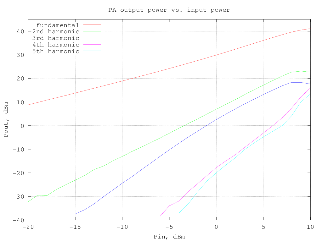 The data above are summarized in the following picture; all data were measured with -30 dBm at the PA input (i.e. approximately 0 dBm output):