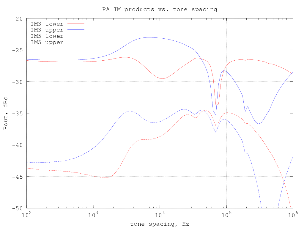the upper and lower IMD tones amplitude are significantly different at large spacing and have a large variation with frequency; this is likely due to interactions between the bias network baseband impedance and thermal effects.