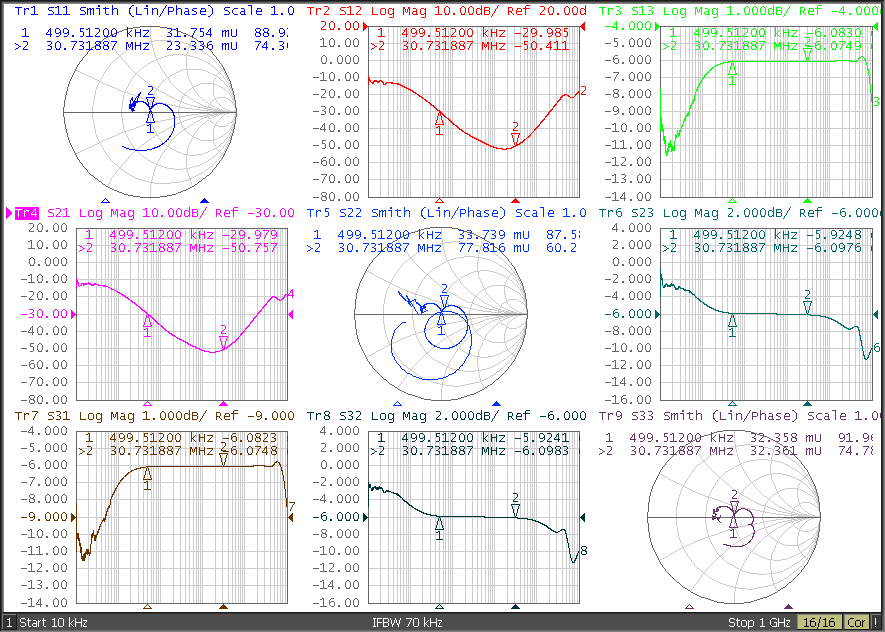 Then recently I had to opportunity to measure it on a modern multiport network analyzer, so I quickly got some nice graph showing all its S-parameters: