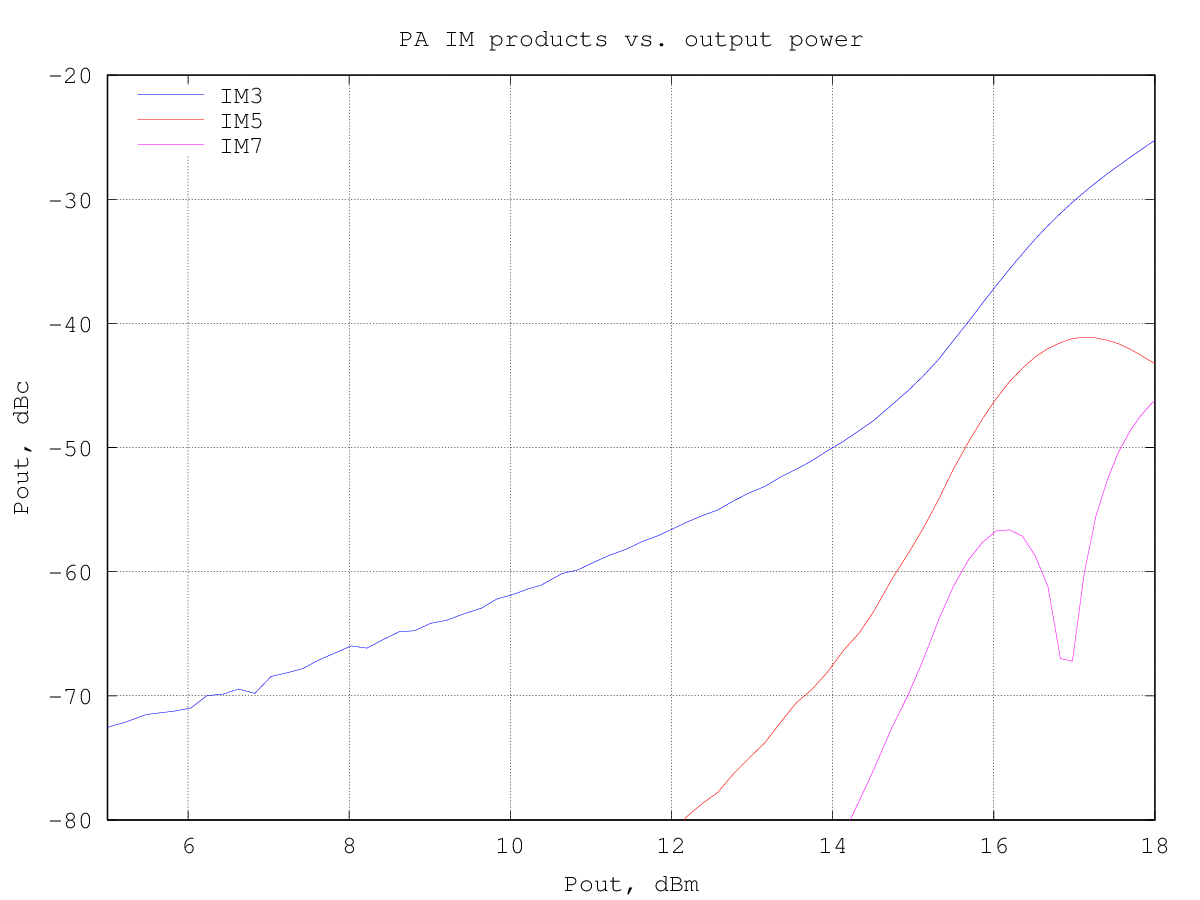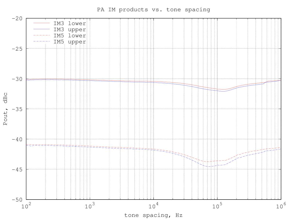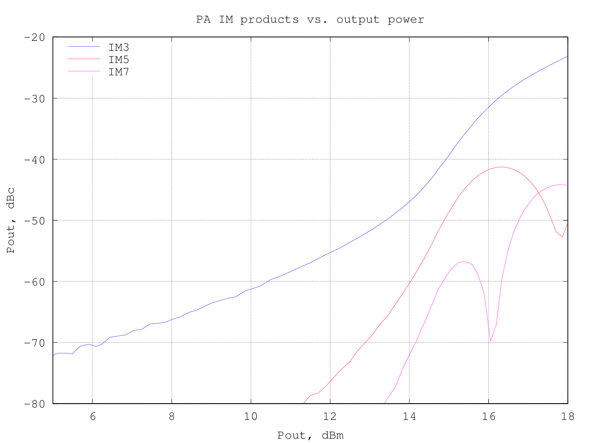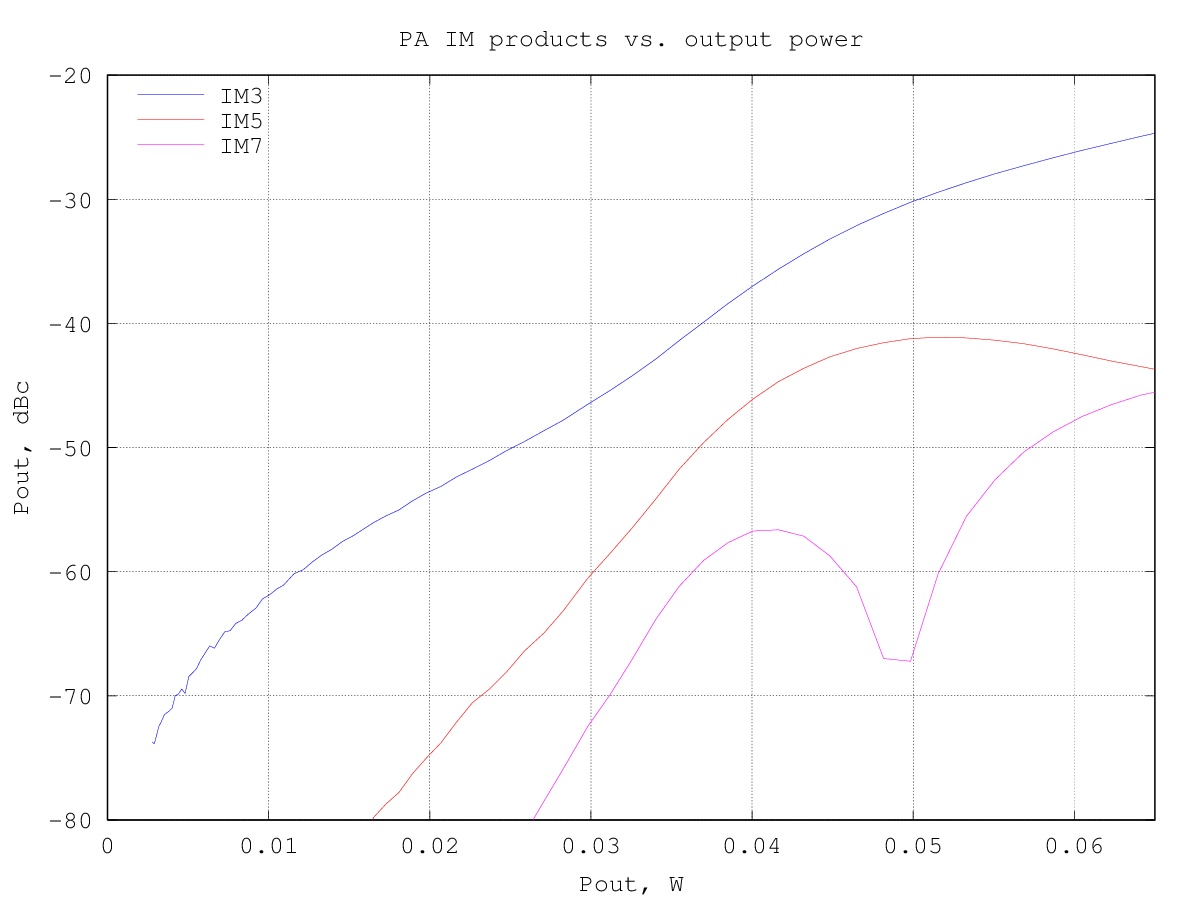 The third-order intermodulation products amplitude w.r.t the output power per-tone is shown in the graph below (to obtain the actual [average] output power multiply the value by two, to have the PEP, multiply by 4):