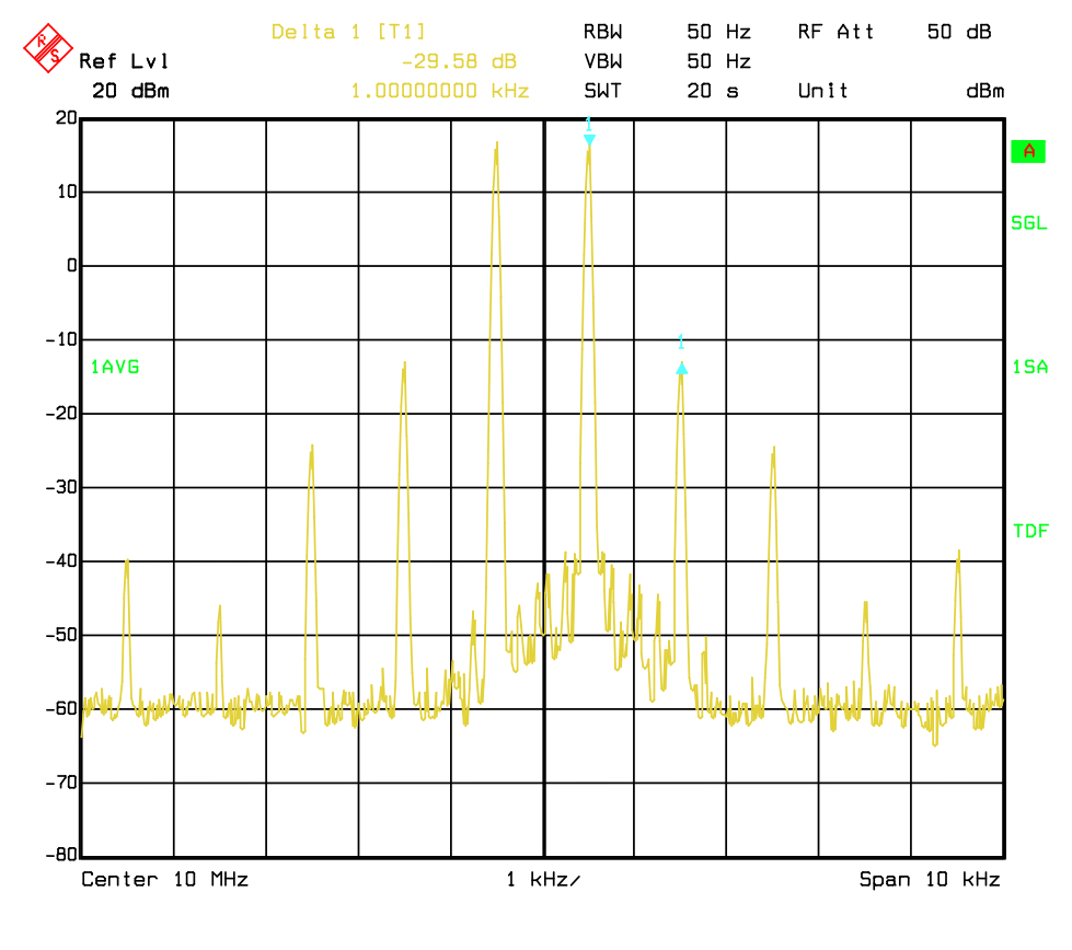 The graph below shows the relative amplitude of the IMD products (separately for upper and lower products) for a two-tone test with varying tone spacing at 170 mW PEP output: