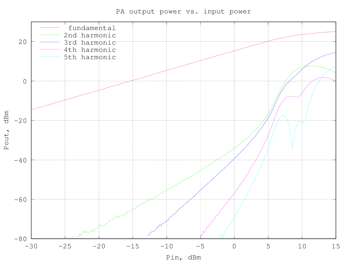 The fundamental and harmonics output levels versus input power, with a 10 MHz sinewave input, is shown in the graph below: