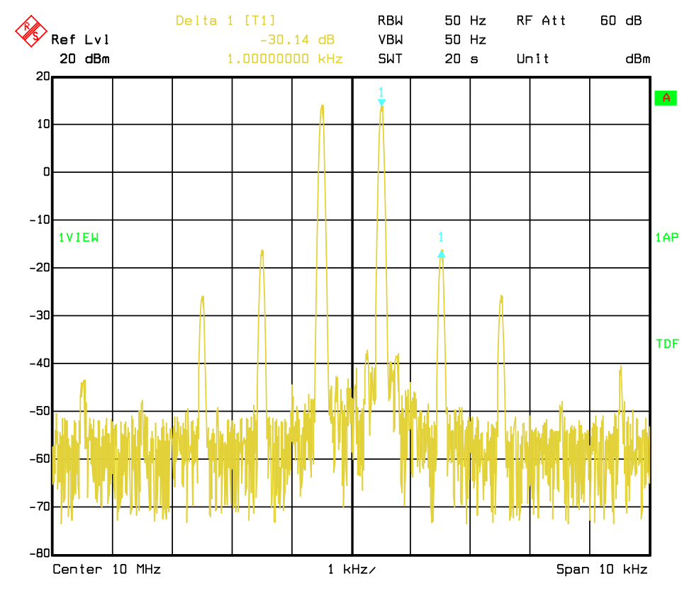 The third-order intermodulation products amplitude w.r.t the output power per-tone is shown in the graph below (to obtain the actual [average] output power multiply the value by two, to have the PEP, multiply by 4):