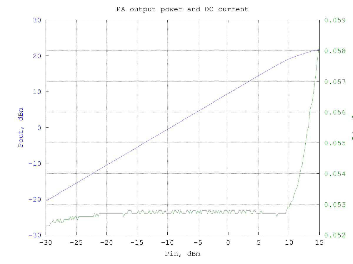 RF output and DC current drawn from the supply versus input power (10 MHz sinewave) are shown in the following graph: