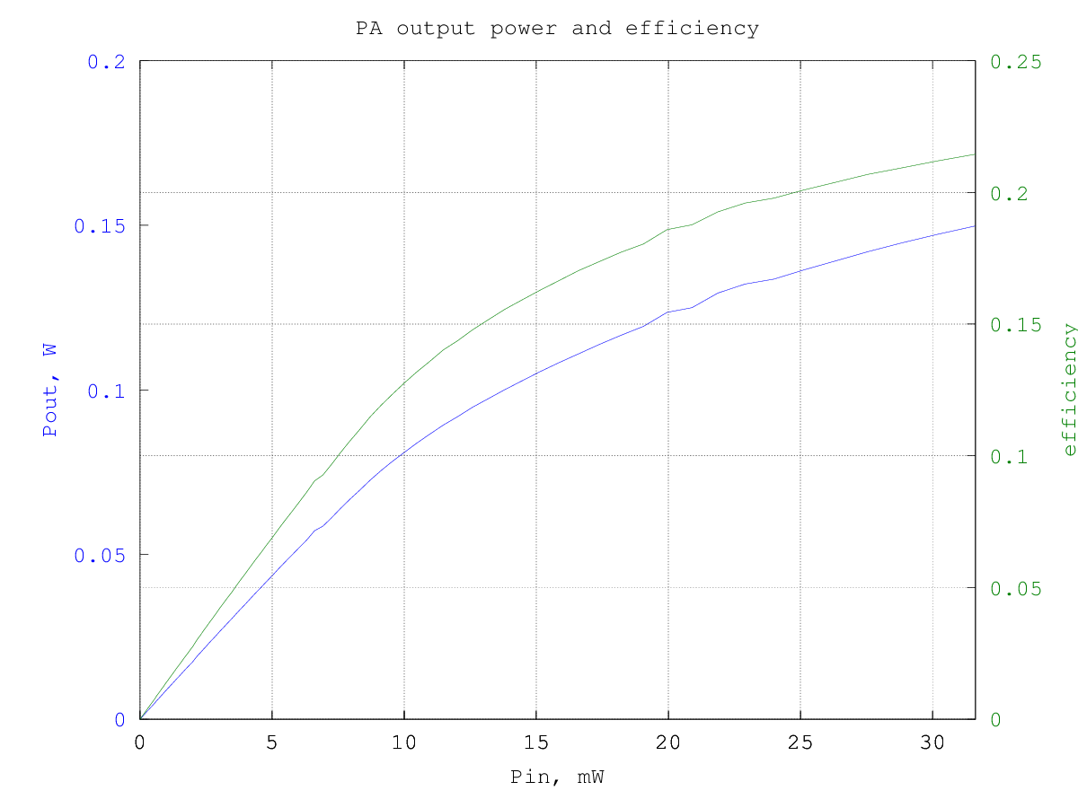 and the resulting efficiency is shown in the graphs below (data are the same for the two graphs, in the first the input and output power are in dBm and in the second they are in watt):