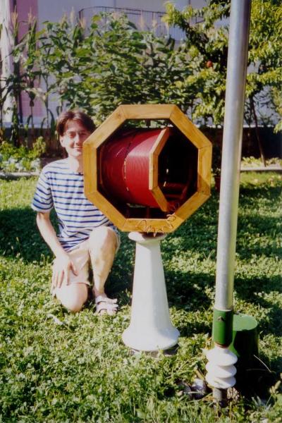 To tune the antenna on 137 kHz I now use a homemade variometer. Its inductance can be varied from nearly 3.9 mH to 1.3 mH; this wide range is useful in /P operation, where one don't know in advance the aerial characteristics. Anyway, my fixed vertical at home need "just" 3.3 mH to reach the resonance. To get an idea of the coils size here is a picture of me holding the variometer at the base of the antenna.