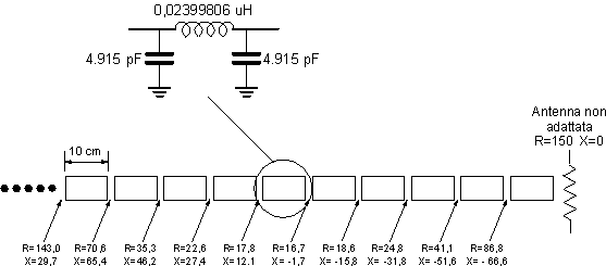 Al solo fine di fornire delle indicazioni quantitative, e senza perdita di generalità, faremo quì riferimento ad una discesa d'antenna realizzata in cavo RG-58, che può essere considerata come costituita da tanti pezzetti di cavo RG-58 lunghi ciascuno 10 cm e posti uno di seguito all'altro (ovvero in cascata). Tale situazione è mostrata in Figura 32, ove i pezzetti di cavo da 10 cm vengono visualizzati come tanti "vagoncini", il primo dei quali si suppone sia connesso ad un'antenna adattata, ovvero con impedenza [R= 50 X= 0].