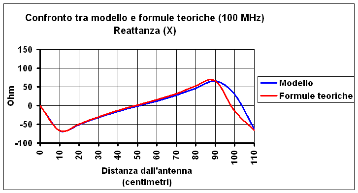 A questo punto è possibile paragonare i valori di impedenza visti da ciascun vagoncino con quelli che risulterebbero applicando invece le formule teoriche delle linee di trasmissione, diagrammati in Figura 1. Le Figure 34 e 35 mostrano come varino rispettivamente resistenza e reattanza lungo la linea, sia secondo il modello a vagoncini di tipo pi-greco che secondo le formule teoriche. In particolare dette figure rappresentano gli andamenti lungo i primi 110 cm di cavo (11 vagoncini da 10 cm) a partire dall'antenna, nel caso in cui la frequenza di lavoro sia 100 MHz. Per tale valore di frequenza, la mezza lunghezza d’onda si raggiunge a 98,85 cm dall’antenna (avendo tenuto in conto un fattore di velocità del cavo pari a 0,659).