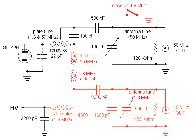 Band switching is very simple: at 1.8 MHz, a ceramic relay grounds the 50-MHz RF output, thus preventing 1.8-MHz energy from reaching that output. Besides, the 500-pF capacitor gets so grounded, it de-facto becoming the plate capacitor for the 1.8-MHz pi-network (it can be demonstrated that the left-hand side part of the rotary coil has a negligible effect at 1.8 MHz, and can then be disregarded for all practical purposes).