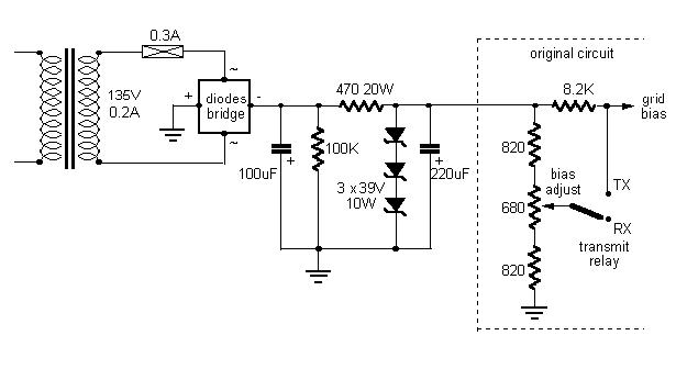 The three zener diodes shall be mounted on an heat sink. The transmit relay is operated simultaneously with the antenna relay. Grid bias so varies from -120 V (RX mode) to an adjustable value around -80 V (TX mode).